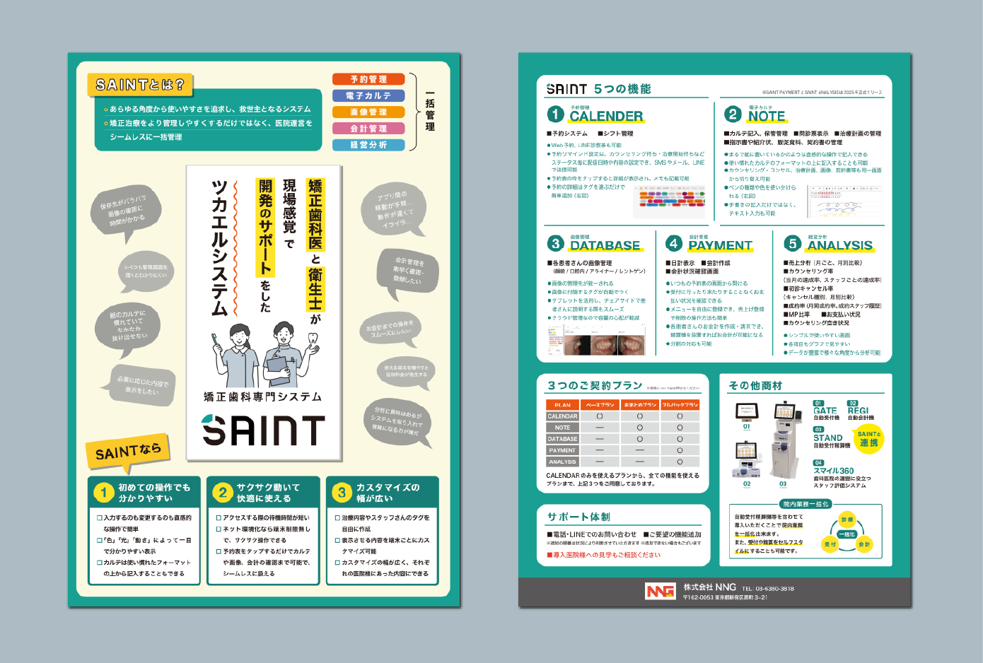 株式会社NNG様の『矯正歯科専門システムSAINT』の製品紹介チラシをデザインさせていただきました。