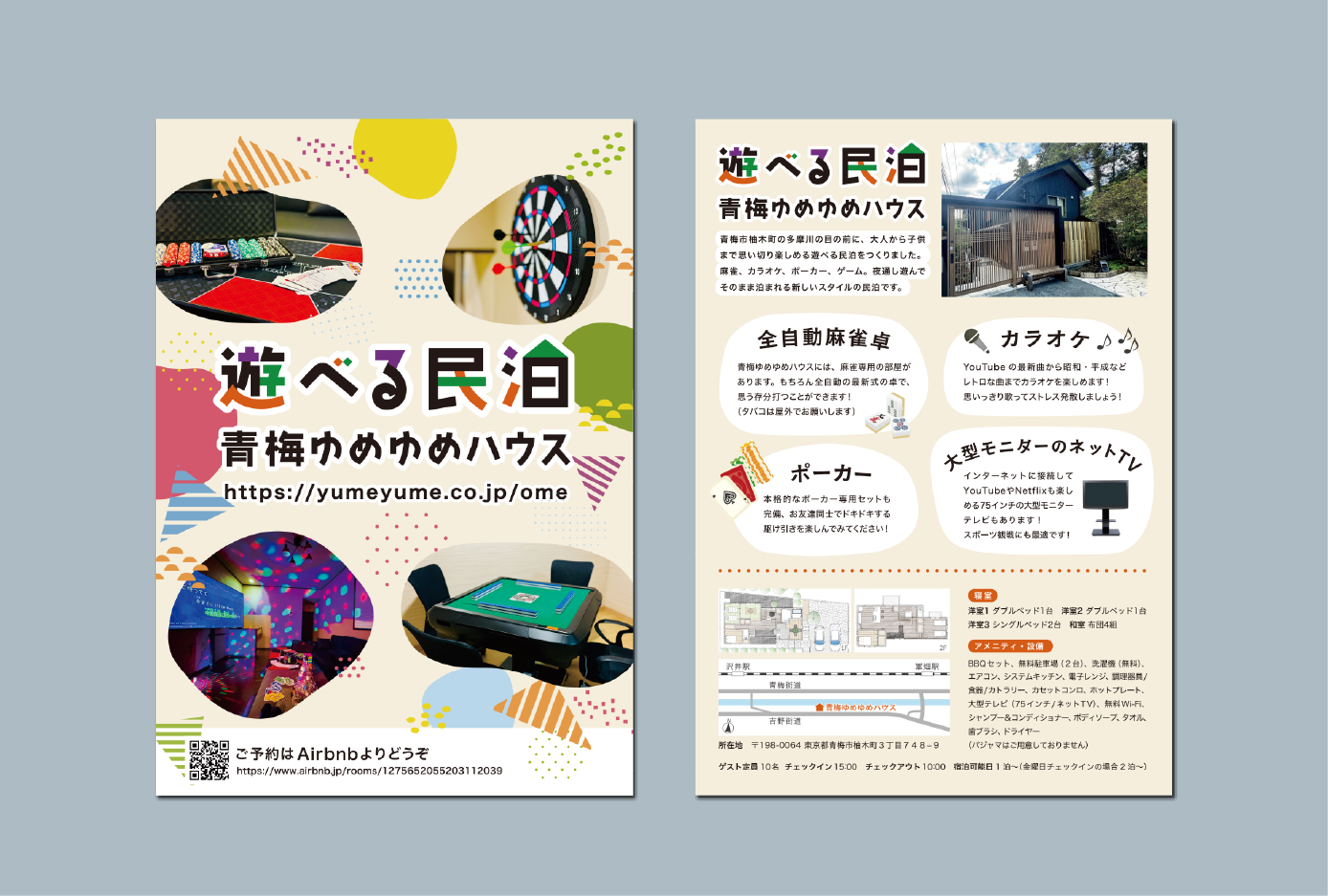 カラオケや麻雀で思い切り遊べる民泊「青梅ゆめゆめハウス」様のフライヤーをデザインさせていただきました。